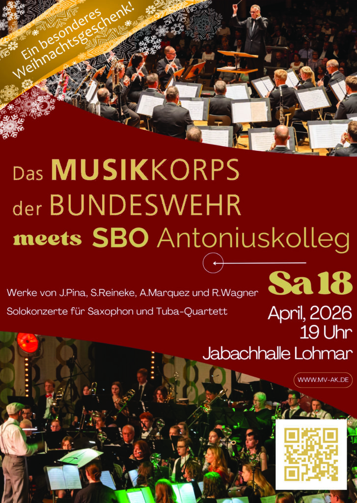 Das „Sinfonische Blasorchester Antoniuskolleg“ lädt sie am Samstag, den 18.04.26 um 19 Uhr in die Jabachhalle Lohmar zu einem ganz besonderen Höhepunkt ihrer 120-jährigen Vereinsgeschichte ein: „Wir haben die Ehre, in diesem außergewöhnlichen Konzert gemeinsam mit dem „Musikkorps der Bundeswehr“, einem der führenden Blasorchester Europas, auf einer Bühne zu musizieren“.